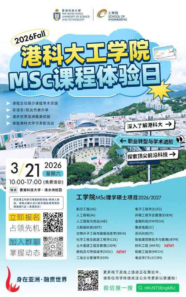 🌟在屏幕前反复翻看课程简章,不如亲自来一趟清水湾校园! 校园体验日----香港科技大学工学院理学硕士MSc课程专场 👏诚邀优秀学子到访清水湾校园!